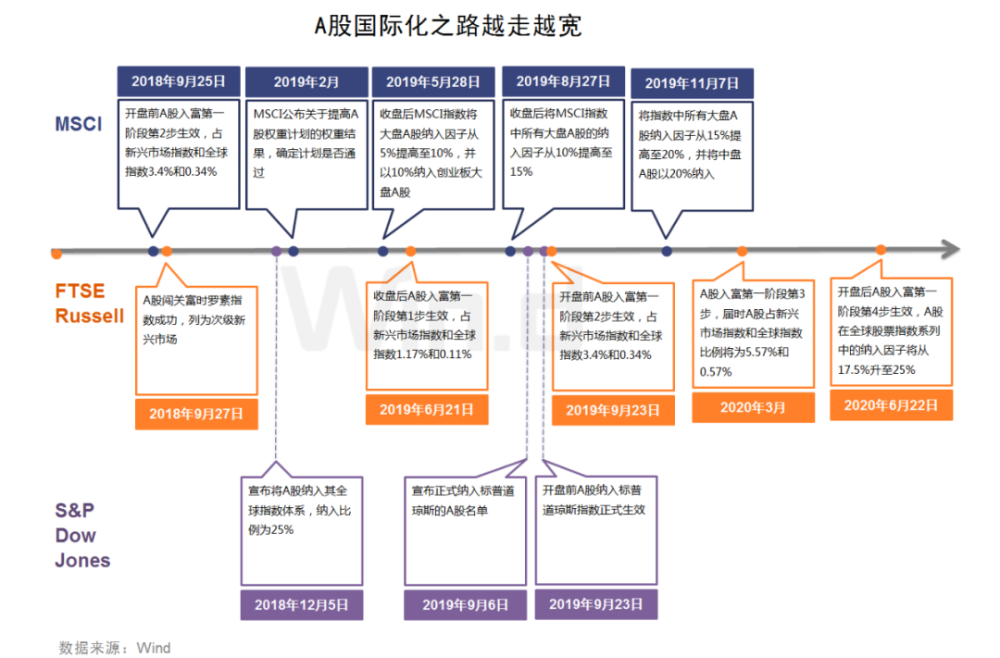 与此同时,msci也在官网披露了后续8次季度调整的时间。 富时罗素和标普道琼斯指数也相继将 a 股纳入其核心指数产品,根据富时罗素之前的公告,2020 年 3 月将进行其第一阶段最后一步扩容程序.